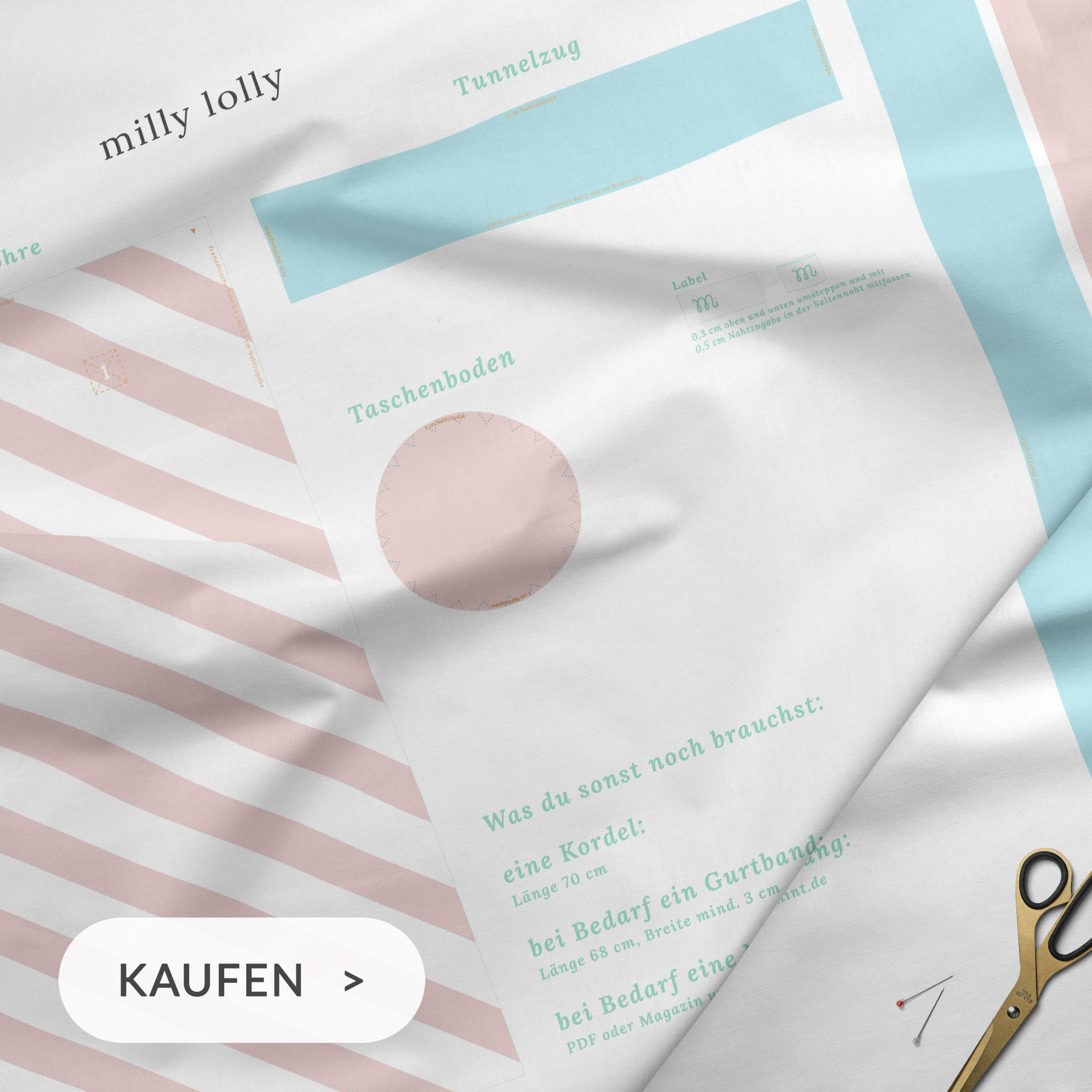 Der optimale Stoff für diese Yogatasche ist ein Jeansstoff aus 100 % Baumwolle, mit einer groben Twillbildung für Stabilität und Halt. Auf dem milly mint Stoff sind die Schnittteile der Tasche mit Nahtzugaben und Markierungen platziert. Außerdem findest du auf dem Stoffteil fertig gedruckte Gurtbänder in verschiedenen Farben zum selbst Nähen. Du kannst diese mit Vlieseline belegen oder für stärkere Beanspruchung auch ein fertiges Gurtband kaufen. Jetzt brauchst du nur noch eine schöne Kordel und den passenden Faden und es kann losgehen. Viel Spaß!