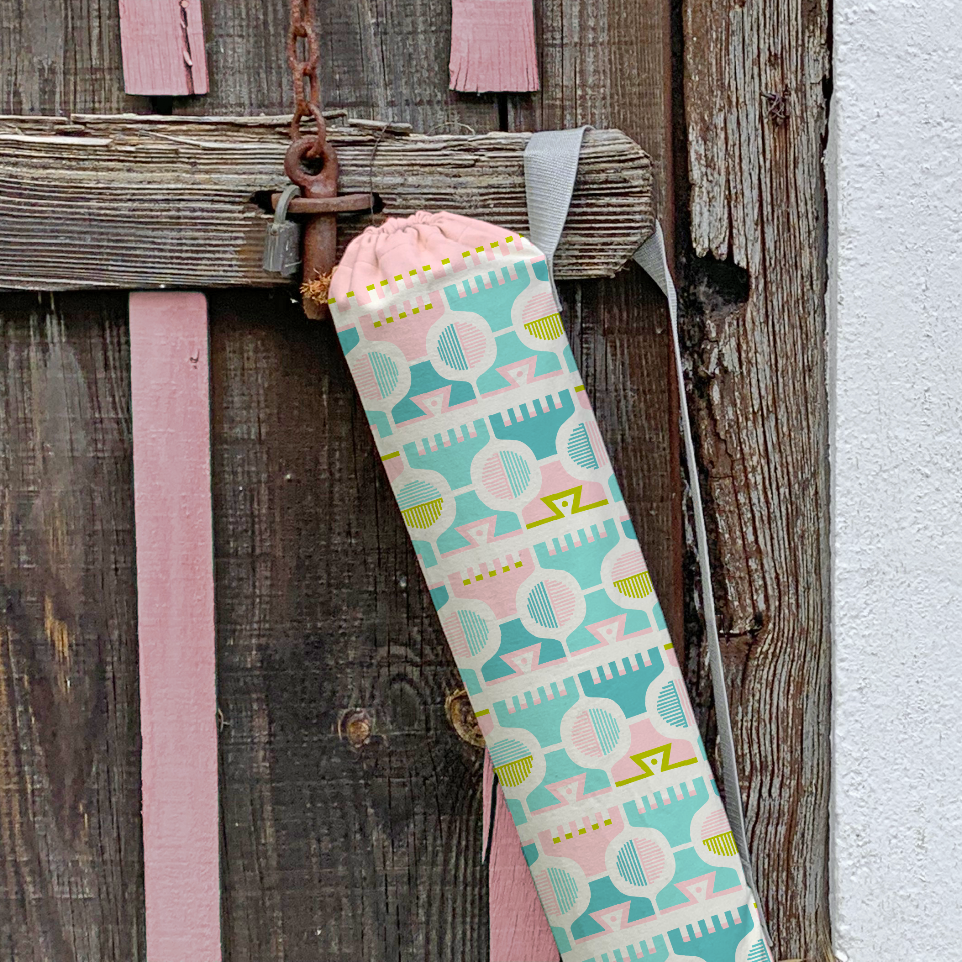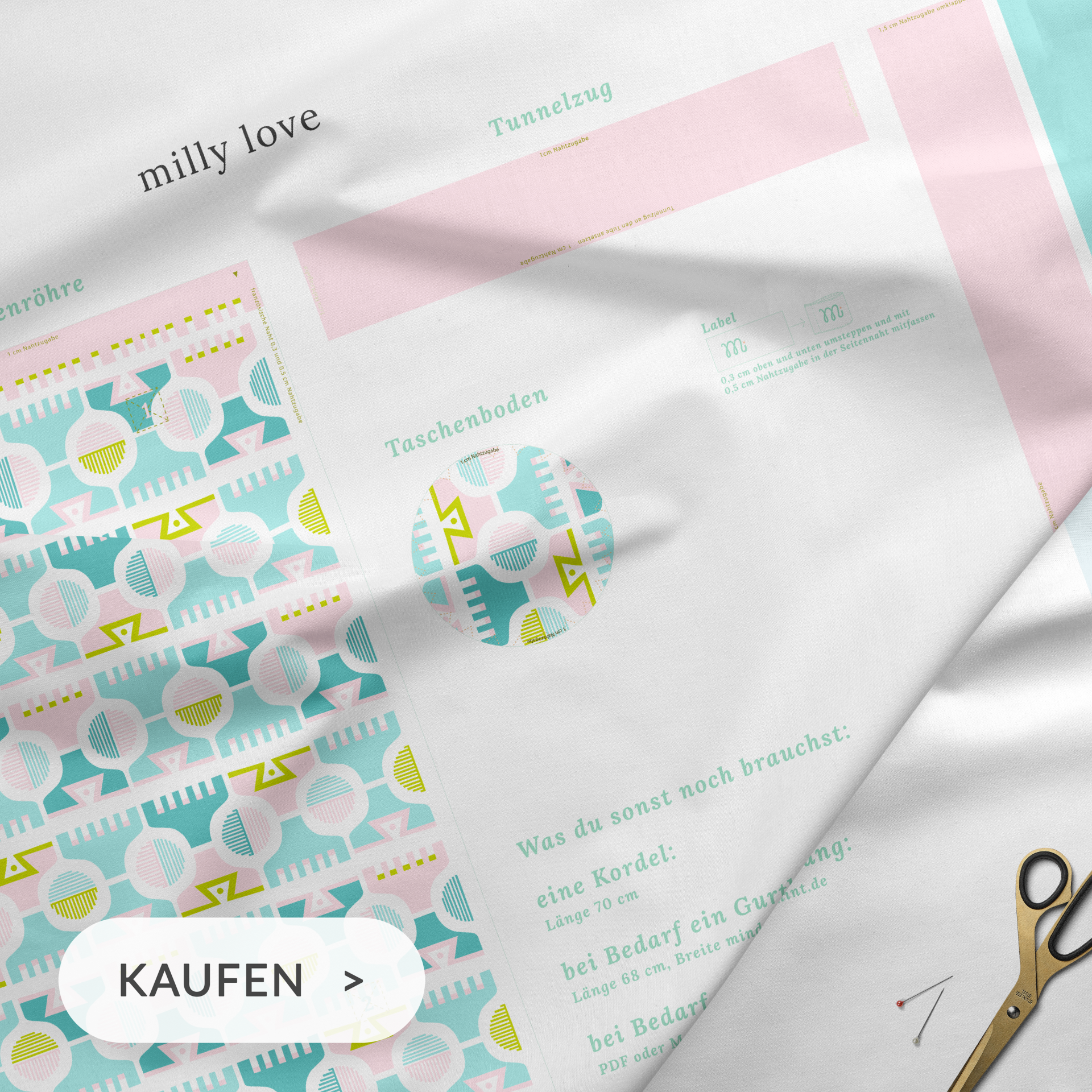 Der optimale Stoff für diese Yogatasche ist ein Jeansstoff aus 100 % Baumwolle, mit einer groben Twillbildung für Stabilität und Halt. Auf dem milly mint Stoff sind die Schnittteile der Tasche mit Nahtzugaben und Markierungen platziert. Außerdem findest du auf dem Stoffteil fertig gedruckte Gurtbänder in verschiedenen Farben zum selbst Nähen. Du kannst diese mit Vlieseline belegen oder für stärkere Beanspruchung auch ein fertiges Gurtband kaufen. Jetzt brauchst du nur noch eine schöne Kordel und den passenden Faden und es kann losgehen. Viel Spaß!