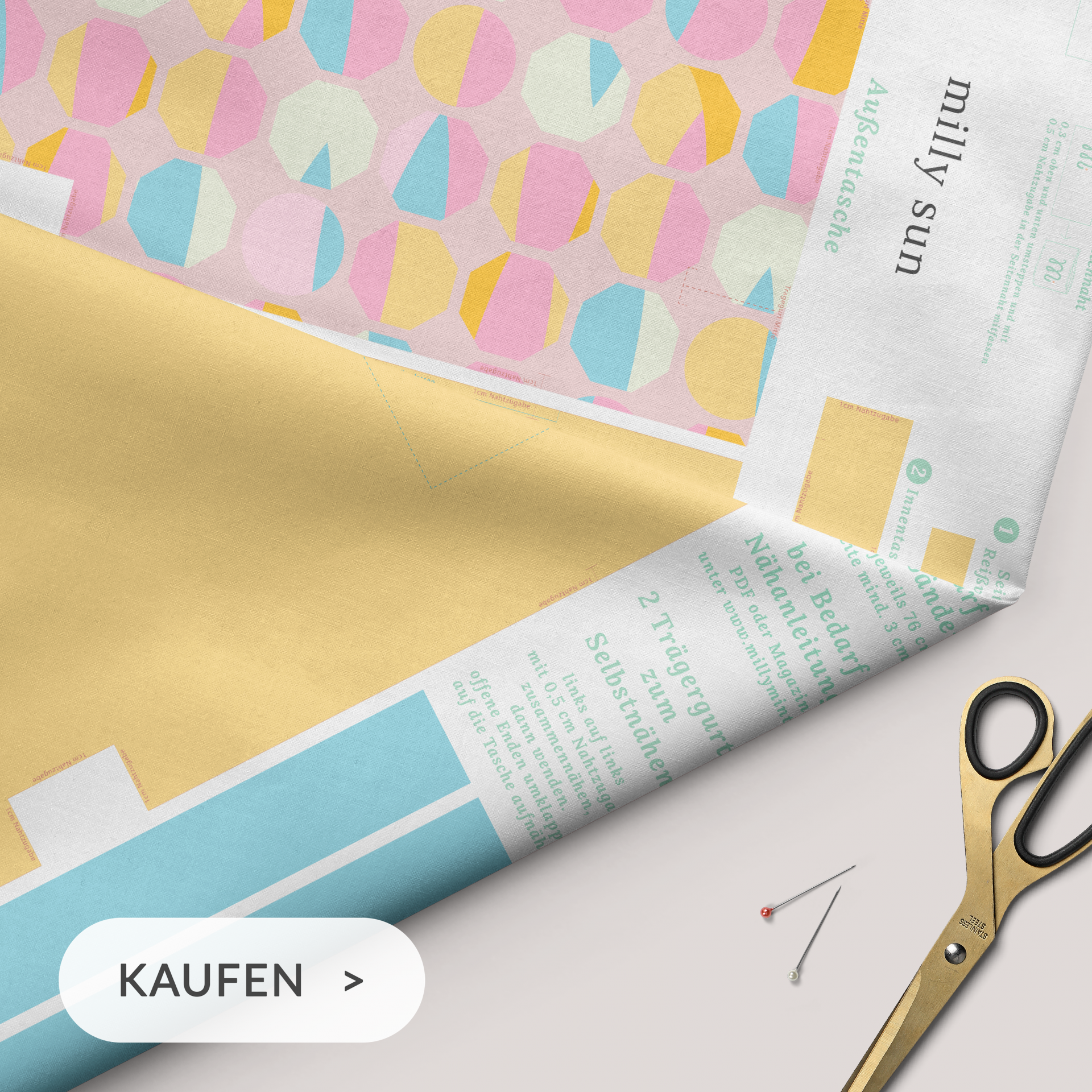 Der optimale Stoff für diese Alltagstasche ist ein Leinen Baumwoll Canvas Gemisch, bestehend aus 55 % Leinen und 45 % gekämmter Baumwolle, mit einem natürlichen Look. Auf dem milly mint Stoff sind mehrere Schnittteile mit Nahtzugaben und Markierungen aufgedruckt, bestehend aus einer Außentasche und einem Innenfutter mit aufgesetzter Einschubtasche für Geldbeutel oder Handy. Hierzu wird noch zusätzlich ein Reißverschluss von 17,5 cm benötigt. Außerdem findest du auf dem Stoffteil gedruckte Gurtbänder in verschiedenen Farben zum selbst Nähen. Für etwas mehr Stabilität und Halt kann entweder Vlieseline aufgebügelt oder auch ein spezielles Gurtband verwendet werden. Jetzt brauchst du nur noch den passenden Faden und es kann losgehen. Viel Spaß!